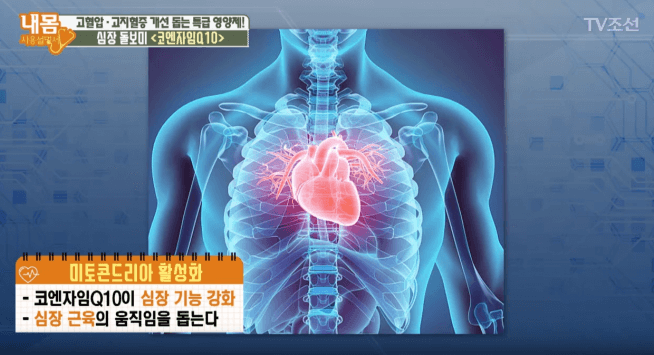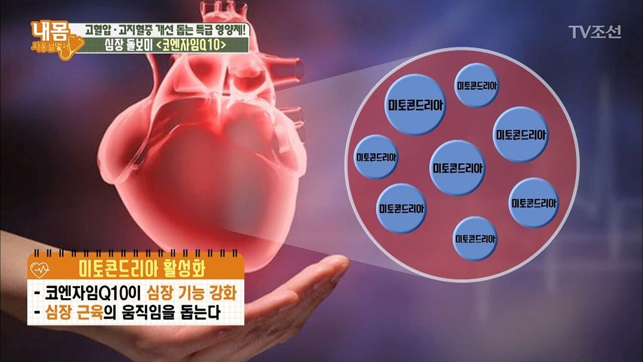 코엔자임 큐텐은 인체 중 심장에 많이 분포하고 있기 때문에 심장 비타민이라고 불린다. 심장은 체내 전체를 순환하는 기능으로 일상 기능에 필수적인 요소이다. 심장 및 혈관에 쌓여있는 산화 스트레스에서 보호해주며 심장 부정맥, 고혈압, 심부전 등의 건강 상태를 관리하는 데에 유용하다.