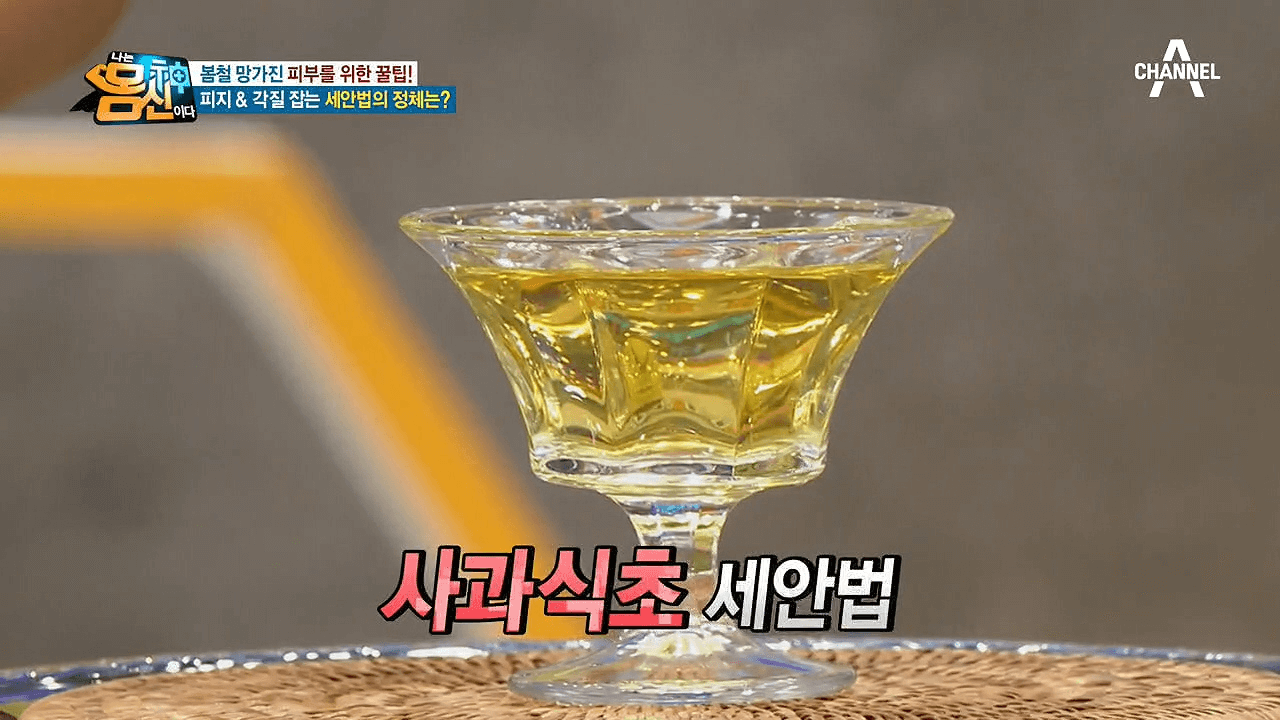 가볍게 클렌징 세안을 마치고 나면, 헹굼 마지막 단계에서 미온수 3리터와 사과식초 1큰술을 혼합한다. 그리고 3분 동안 얼굴에 사과식초 물에 적신다. 가볍게 세수 하듯이 적신 다음 깨끗한 찬물로 헹궈주면 된다.