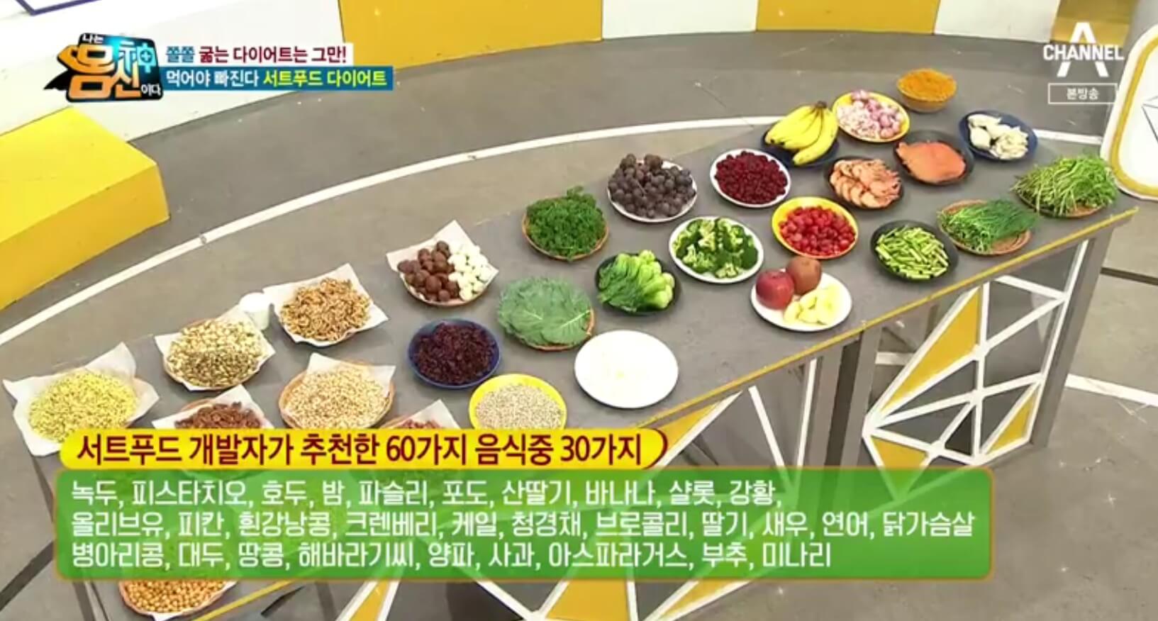 서트푸드 개발자 에이든 고긴스가 제인하는 60 가지의 재료가 있다. 우리나라에서 구하기 쉬운 재료이기 때문에 서트푸드 다이어트 방법 따라하는 데에 어렵지 않다. 양파, 사과, 아스파라거스, 부추, 미나리, 땅콩, 해바라기씨, 대두, 병아리콩, 닭가슴살, 녹두, 피스타치오, 새우, 연어, 새우, 딸기, 브로콜리, 청경채, 케일, 호두, 밤, 파슬리, 바나나, 샬롯, 강황, 올리브유, 흰강낭콩, 크렌베리, 포도, 산딸기, 바나나가 있다.