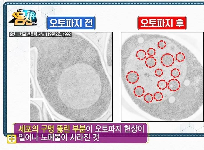 2016년 노벨상 수상자인 오스미 교수가 효모의 오토파지 현상을 관찰한 모습이다. 세포의 구멍 뚫린 부분이 바로 오토파지 현상으로 인하여 노폐물이 사라진 것이다. 우리의 세포는 노폐물이 많아지면 많아질수록 격리막이 출현하여 노폐물을 감싸 모으게 된다. 이때 노폐물이 많아지게 되면 세포변이가 일어나고 세포가 변이됨에 따라 암을 유발하게 된다. 이로 인해 치매 각종 질병에 노출될 수 있으며 면역력까지 떨어지게 된다.