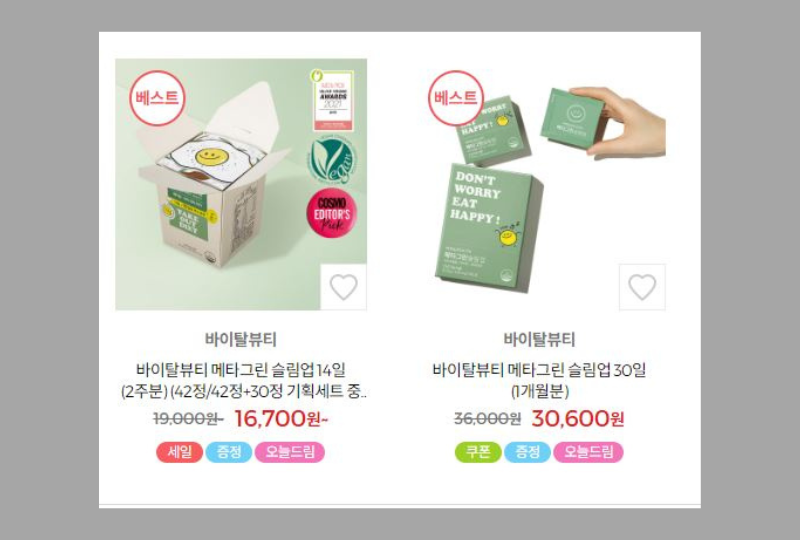올리브영에 입점되어 있는 바이탈뷰티는 할인 이벤트 및 기획 상품에 따라 14일 분과 30일 분 나눠져 있다. 일상 속에서 가벼운 다이어트 및 식이 관리가 필요한 사람들이라면 행사 기간에 맞춰서 메타그린 슬림업 다이어트에 도전하길 바란다.