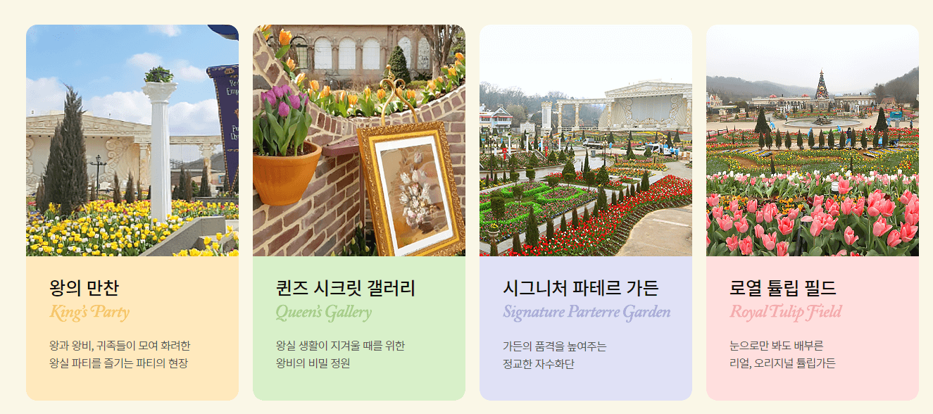 럭셔리 유럽 왕실의 튤립 정원을 재현한 에버랜드 로열 튤립 가든! 따뜻한 봄 햇살 아래, 마치 왕과 왕비가 된 듯 튤립 가든을 거닐며 인생 최고의 봄날을 만들어 보세요. Tip! 포시즌즈 가든 확장으로 작년보다 훨씬 멋진 튤립 가든을 만날 수 있어요!