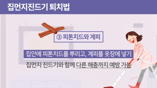 스팀청소기로는 살충 효과만 있기 때문에 집먼지 진드기나 배설물을 제대로 없애주진 못한다. 이럴 때에는 이불 먼지떨이로 직접적으로 두들기면서 제거하는 것이 좋다. 또한 화학첨가물이 없는 천연 100% 원액을 활용하여 안전하게 집먼지 진드기를 퇴치할 수 있다. 계피나 편백수, 피톤치드를 활용하여 탈취 효과와 함께 집먼지 진드기를 예방해보자