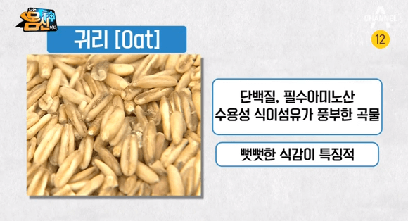 귀리 : 쌀과 비슷하게 생긴 귀리 곡물을 활용하여 밥과 함께 섞어서 만들거나 볶은 귀리의 오트밀로 섭취한다.