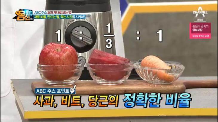 나는 몸신이다 ABC주스를 만드는 데에 있어서 주의해야 할 점이 있다. 비트의 사용량을 반드시 지켜야 할 필요가 있다. 비트가 가지고 있는 불용성 옥살산 성분이 함유되어 있어 많이 섭취할 시에는 복통과 설사를 유발할 수 있다. 또한 주스를 만들 때에는 착즙기보다는 믹서기나 블렌더를 활용하여 재료 자체에 식이섬유를 함께 섭취해야 한다.