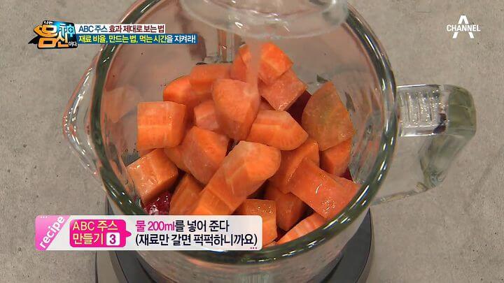 ABC 주스 비율을 사과 1개, 비트 1/3개, 당근 1개, 그리고 꿀과 물 200ml 와 함께 믹서기로 갈아 만들면 된다. 꿀은 기호에 따라 첨가한다. 완성된 주스를 하루 1~2회 식전에 마셔주면 뱃살 빠지는 데에 도움을 받을 수 있다. 마지막에 올리브 오일을 1방울 떨어뜨리면 흡수력을 보다 높일 수 있다고 한다. 그 외에 기호에 따라 요거트나 라임 주스 등을 넣어서 활용하면 좋다.