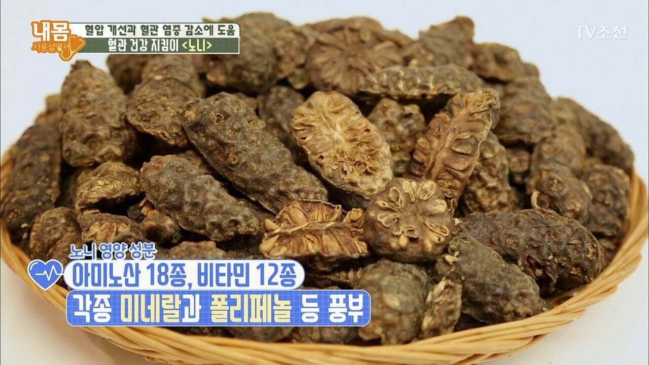 혈관 건강을 지켜주는 것이 노니 열매이다. 노니는 혈압과 공복 혈당 지수를 낮춰주면서 당뇨에 좋은 음식으로 고혈압 증상이나 환자 치료에도 도움을 준다고 알려져 있다. 스코포레틴 성분은 혈관에 쌓여있는 독소와 염증들을 제거하는 항염증 효능이 있다. 그 외에 항염 성분인 스코폴레틴은 천연 진통제라 불리며 항균, 항염증, 항곰팡이, 항히스타민의 소염제 역할로 통증 완화에 좋다.