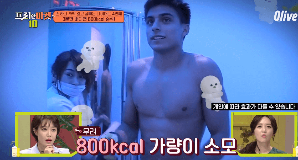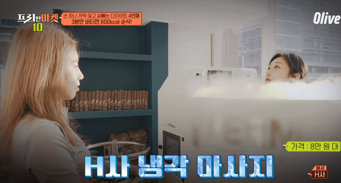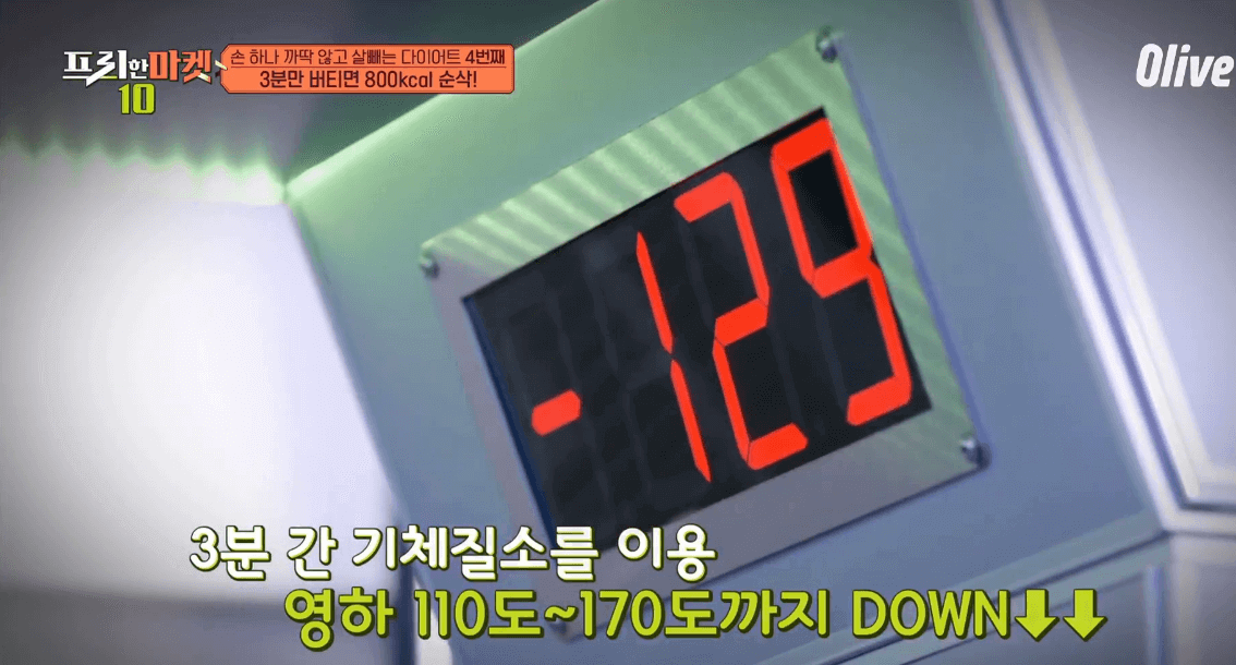 차가운 크라이오 냉각 마사지기에 테라피라는 치료의 의미를 합성하여 크라이오테라피라 말한다. Cryo (차가움) + Teraphy (치료)의 크라이오테라피는 1970년말부터 러시아, 일본 등에서 효과가 입증된 치료 요법 중 하나이다. 일명 3분의 기적으로 질소 증기로 가득 찬 부스에는 영하 110도에서 170도까지 급격하게 온도가 내려간다. 이때 신진대사가 활발하게 움직이면서 혈류 속도 증가 및 다양한 신체 작용이 일어난다. 3분만 버티면 무려 800kcal 태울 수 있는 크라이오 테라피이다.