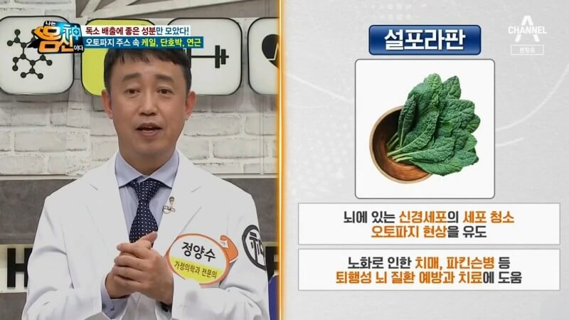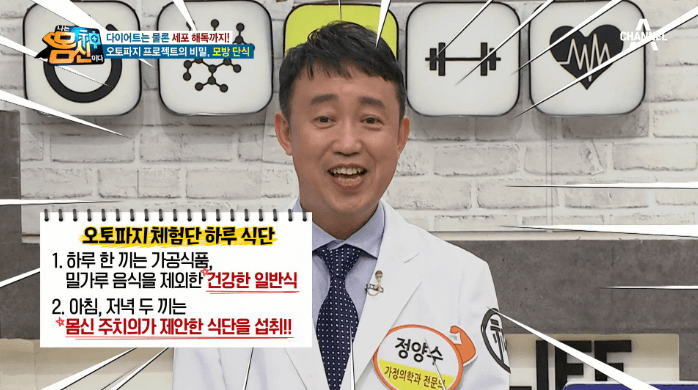 나는몸신이다 주치의로 출연한 정양수 가정의학과 전문의는 오토파지 다이어트를 소개했다. 오토파지는 AUTO 자동의, 스스로 + PHAGE 먹음, 파괴라는 뜻을 가진 합성어로 '스스로 먹어 치운다'는 노폐물 해독 다이어트이다. 우리 몸에는 많은 세포들이 있는데 활동을 하면서 독소와 노폐물들을 끊임없이 남긴다. 체내에 남기지 않고 세포 스스로가 독소와 노폐물을 먹어 치우는 정화 능력으로 오토파지 다이어트를 추천하는 바이다.